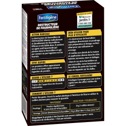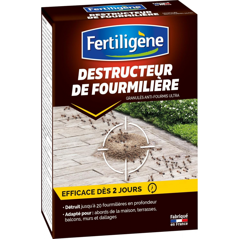 Les granulés anti-fourmis Fertiligène contiennent un insecticide à base de matière active extraite de plante. Ils éliminent radicalement et durablement les fourmilières et les fourmis noires des jardins aux abords de la maison, des balcons, des terrasses, des murs et des dallages.