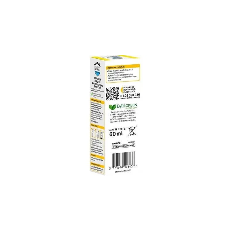 Le diffuseur répulsif HOME DEFENSE combine un flacon de 60ml et huit bâtonnets en rotin pour diffuser en continu un répulsif contre les moustiques, moustiques tigres et mouches. Une fois le bouchon retiré et les bâtonnets plongés dans le liquide, le répulsif se diffuse par capillarité dans la pièce, créant une zone protégée. Le principe actif est le géraniol, un répulsif d’origine végétale réputé pour masquer les odeurs corporelles qui attirent les moustiques, les empêchant ainsi de vous détecter.