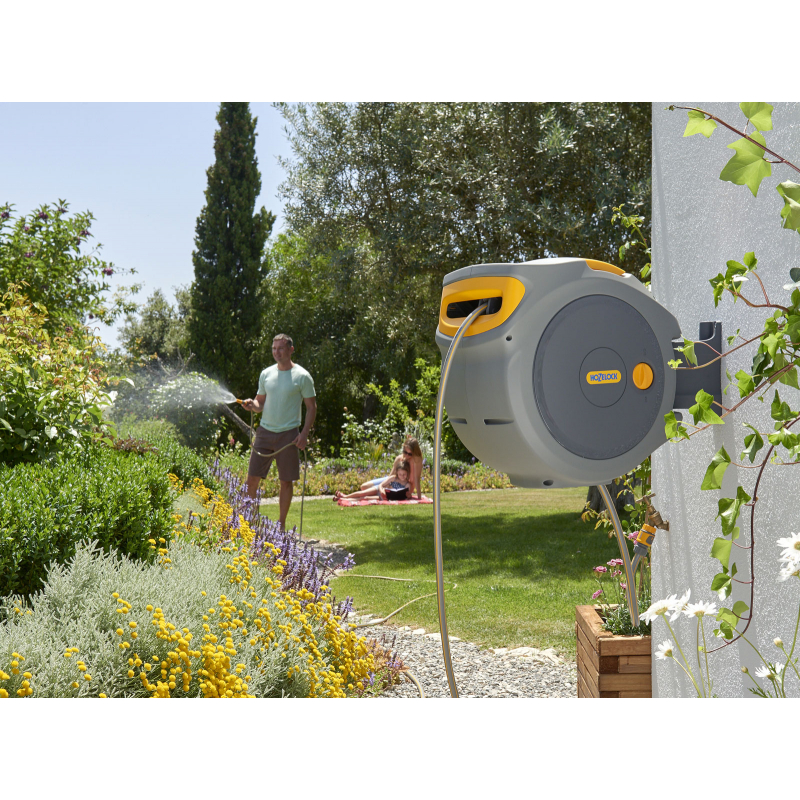 Le dévidoir automatique mural avec 30 m de tuyau de chez HOZELOCK permet à votre tuyau de se ranger tout seul.