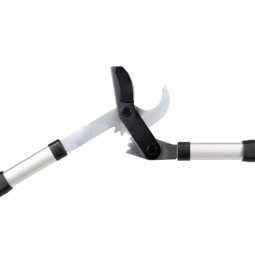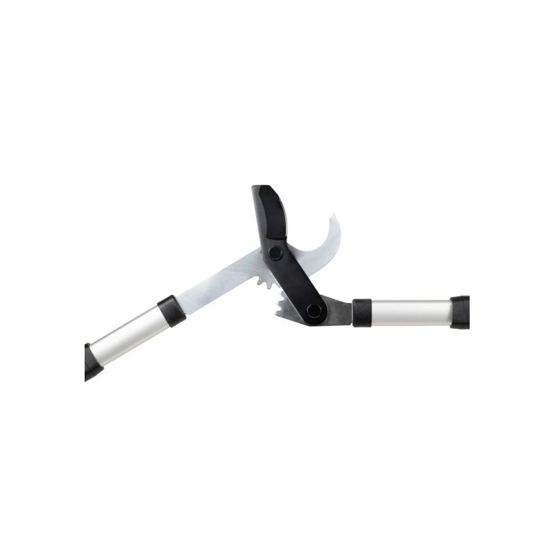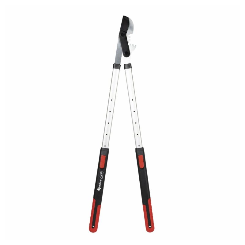 Ébrancheur à deux mains de type bypass, avec manche télescopique et mécanisme à crémaillère qui démultiplie la force pour couper avec moins d'effort.