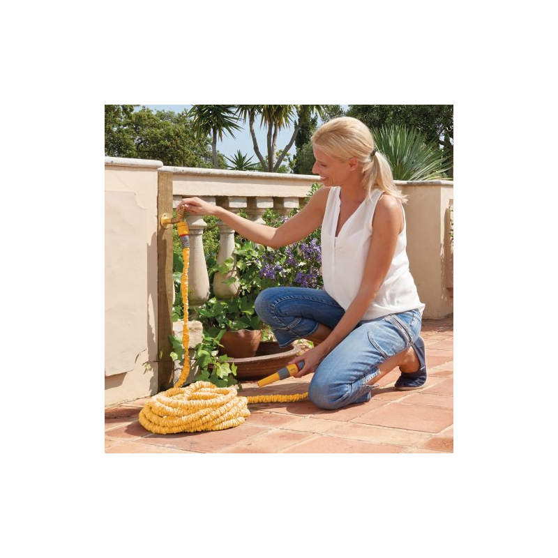 L'ensemble raccords + tuyau d'arrosage extensible de 7,5m SUPERHOZE et le porte-tuyau d’arrosage mural de HOZELOCK vous offrira un gain de place.
